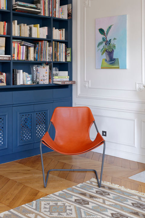 Pour remanier la typologie classique de cet appartement haussmannien avec ses pièces en enfilade sur la façade - entrée, deux salons, chambres, cuisine – l'architecte a modifié le plan d'origine et interrompu cette circulation linéaire :