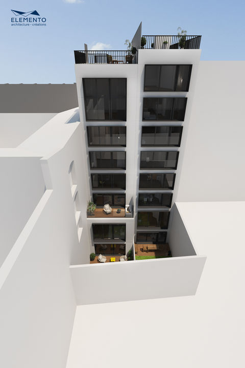 Les deux constructions, en structure béton, se développent sur six étages et comptent 26 appartements, du studio au T3. Nous avons également imaginé les aménagements intérieurs des appartements et des toitures terrasses, nous avons privilégié les plafonds en béton brut pour créer un contraste avec les “boîtes” plus ouvragées abritant le bloc sanitaires et cuisine. Tandis que pour compenser la profondeur des logements, nous avons mis en œuvre des larges ouvertures, qui caractérisent le dessin de la façade.