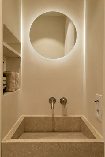 La vue dégagée et la verdure environnante, ont inspiré au client l'envie de donner un esprit d'île grecque à l’appartement par l’emploi de matériaux et des teintes claires et naturelles.