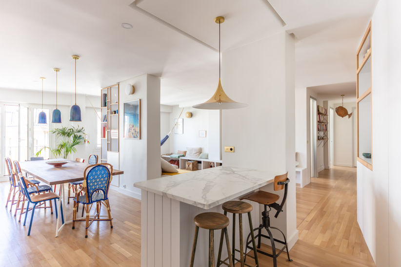 Situé au 6ème étage d'un immeuble années 70, l'appartement d'une centaine de mètres carrés, avait été restauré, mais certains matériaux et aménagements méritaient une valorisation, en particulier la cuisine.