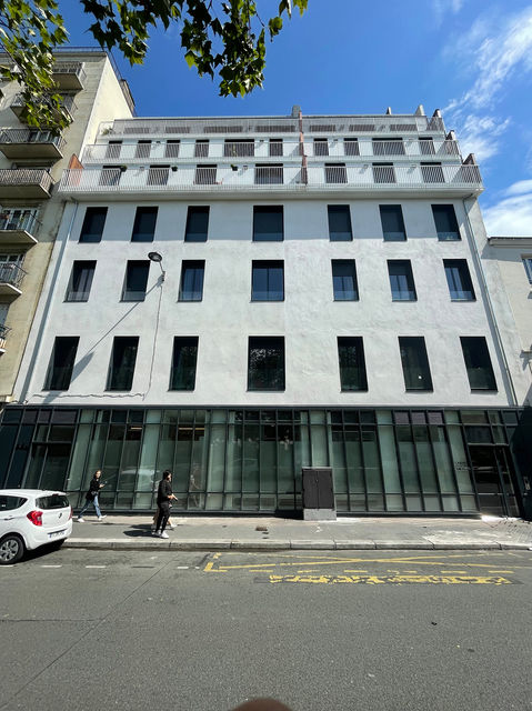Pour assurer la transformation d'usage et l'optimisation des volumes existants, nous avons procédé à une intervention en profondeur : renforcement des fondations, déplacement des circulations verticales et création d’un escalier et d’un ascenseur, remplacement des ouvrants, création de 3 niveaux de surélévation (structure métallique), ravalement des façades existantes et création de façades, création de parties communes, ainsi que création du mur rideau du niveau rue.